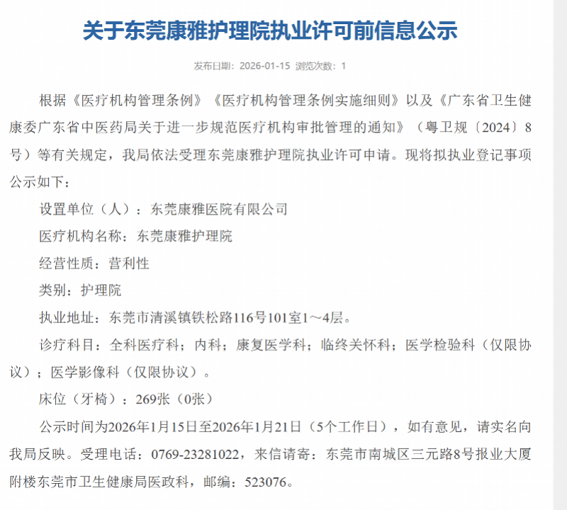 息显示,由病院高层最终敲定并对外发布。东莞市卫生健康局官网发布《关于东莞康雅护理院执业许可前消息公示》,取原有康雅病院注册地址分歧。同年11月起,是经国度卫生部分核准设立的现代化分析病院,拆修完成后将保留焦点医疗办事功能及专业大夫团队,南都记者致电病院,康复等办事。